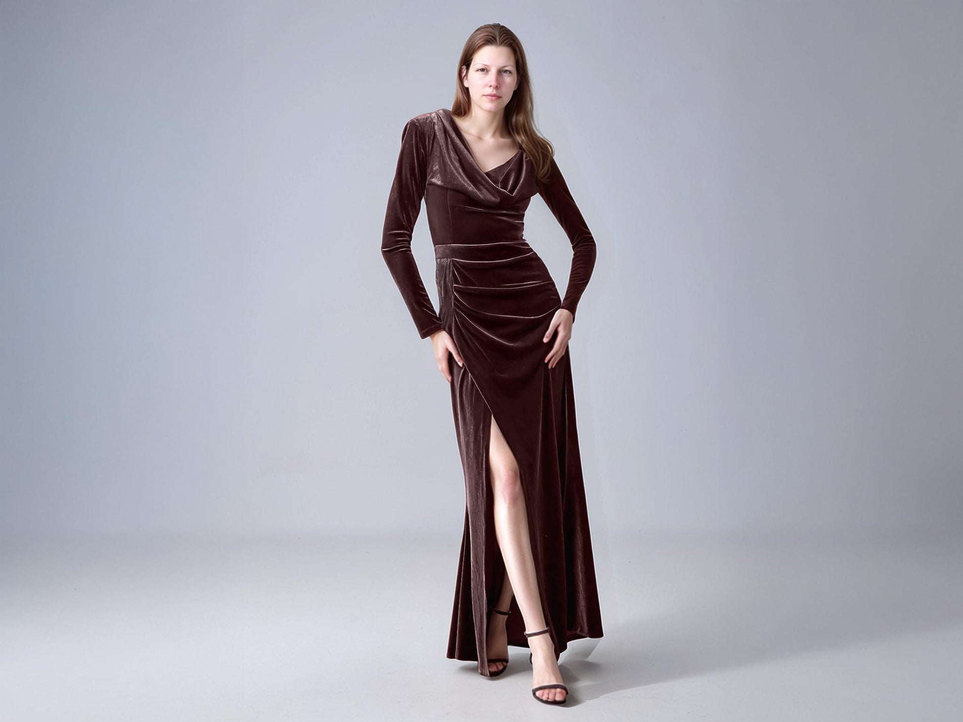 Chocolate Brown Velvet Gown – Long Sleeve Slit Maxi Dress for Formal Events & Parties | SKU.25T17T6I