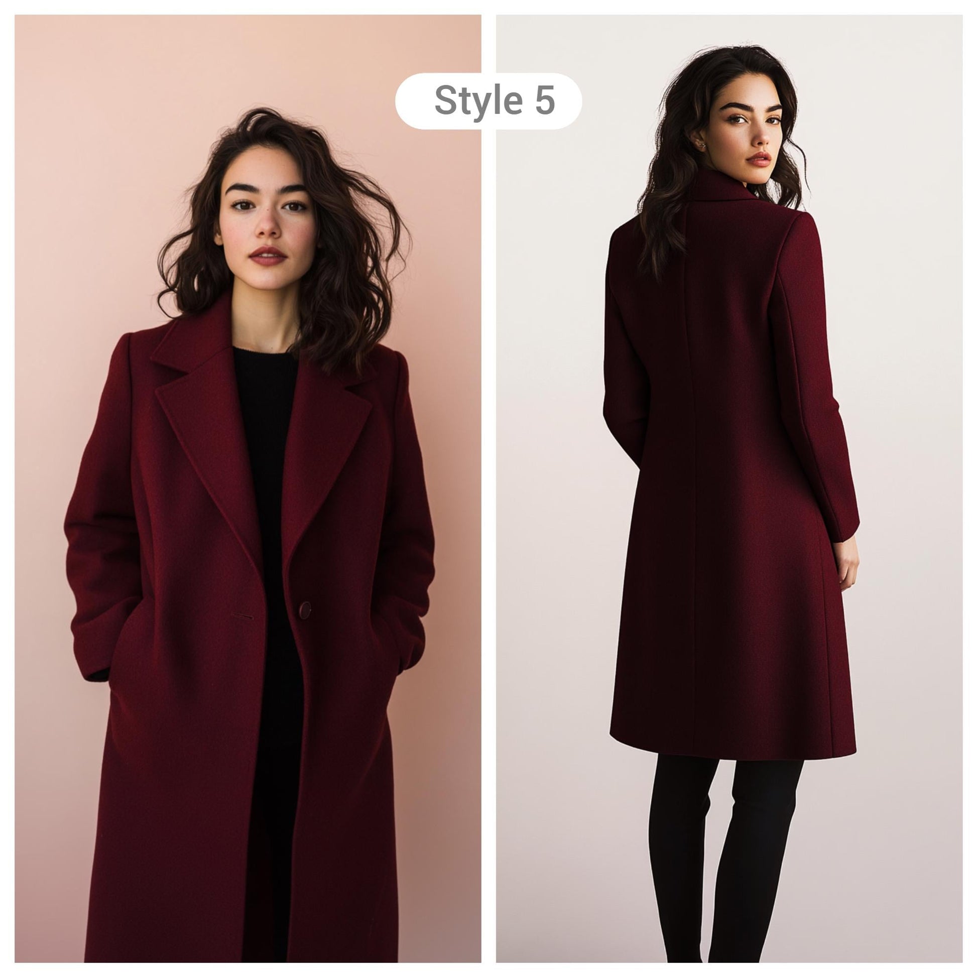 - Design: Long tailored coat in a rich burgundy shade, blending elegance with functionality