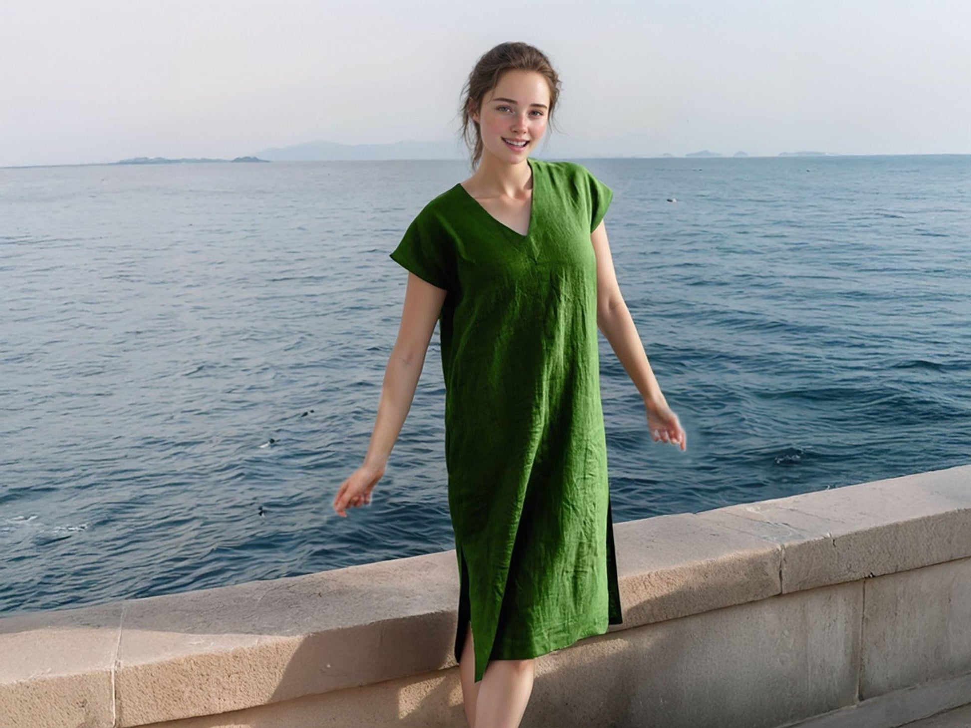 Custom V-Neck Linen Blend Shift Dress - Relaxed Summer Style with Pockets and Side Slit | SKU.25T14T3N