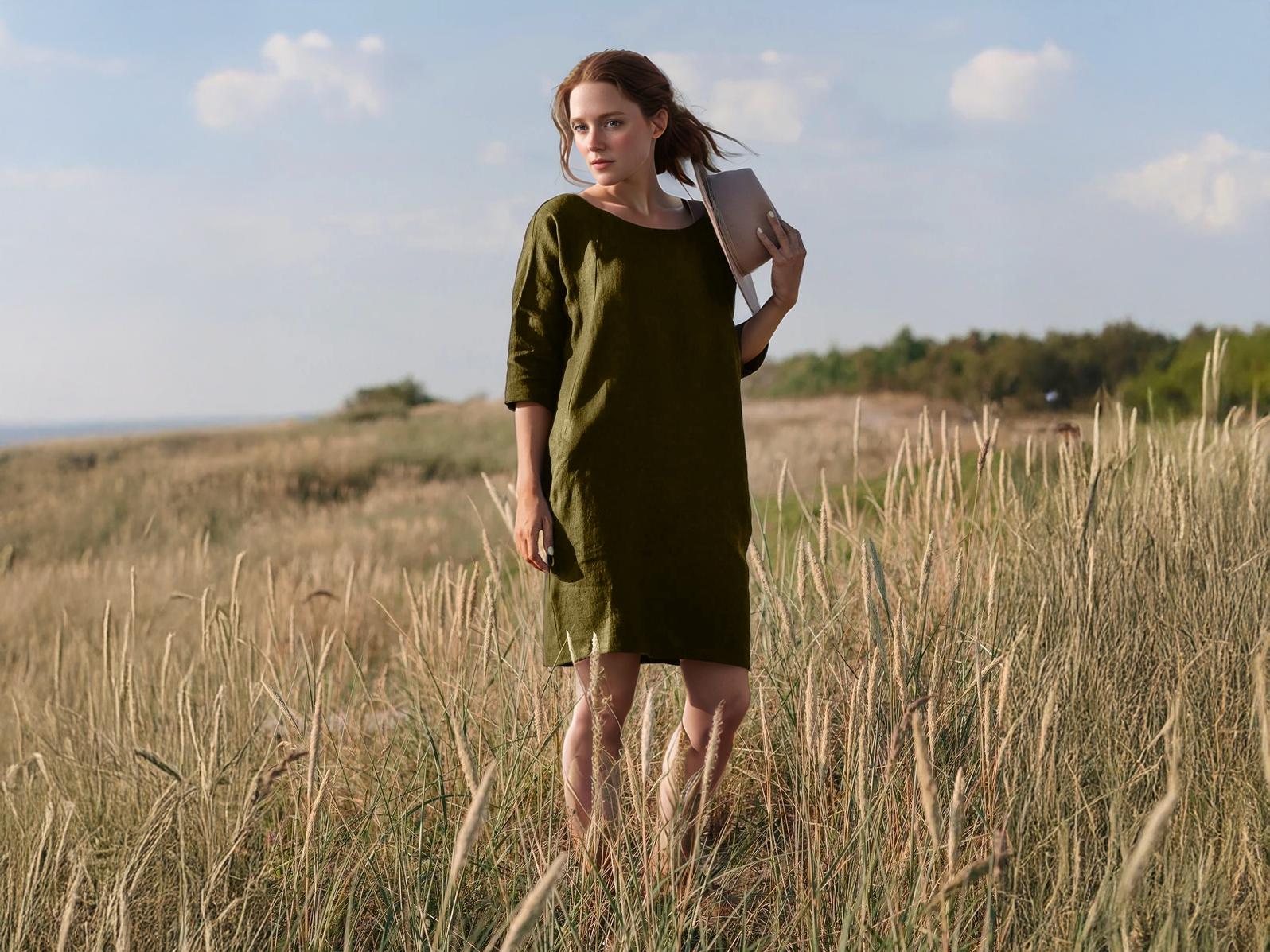 Elegant Green Linen Shift Dress, Long Sleeve Relaxed Fit, Women’s Boho Fall Dress, Minimalist Casual Dress with Pockets| SKU.25T14T7H