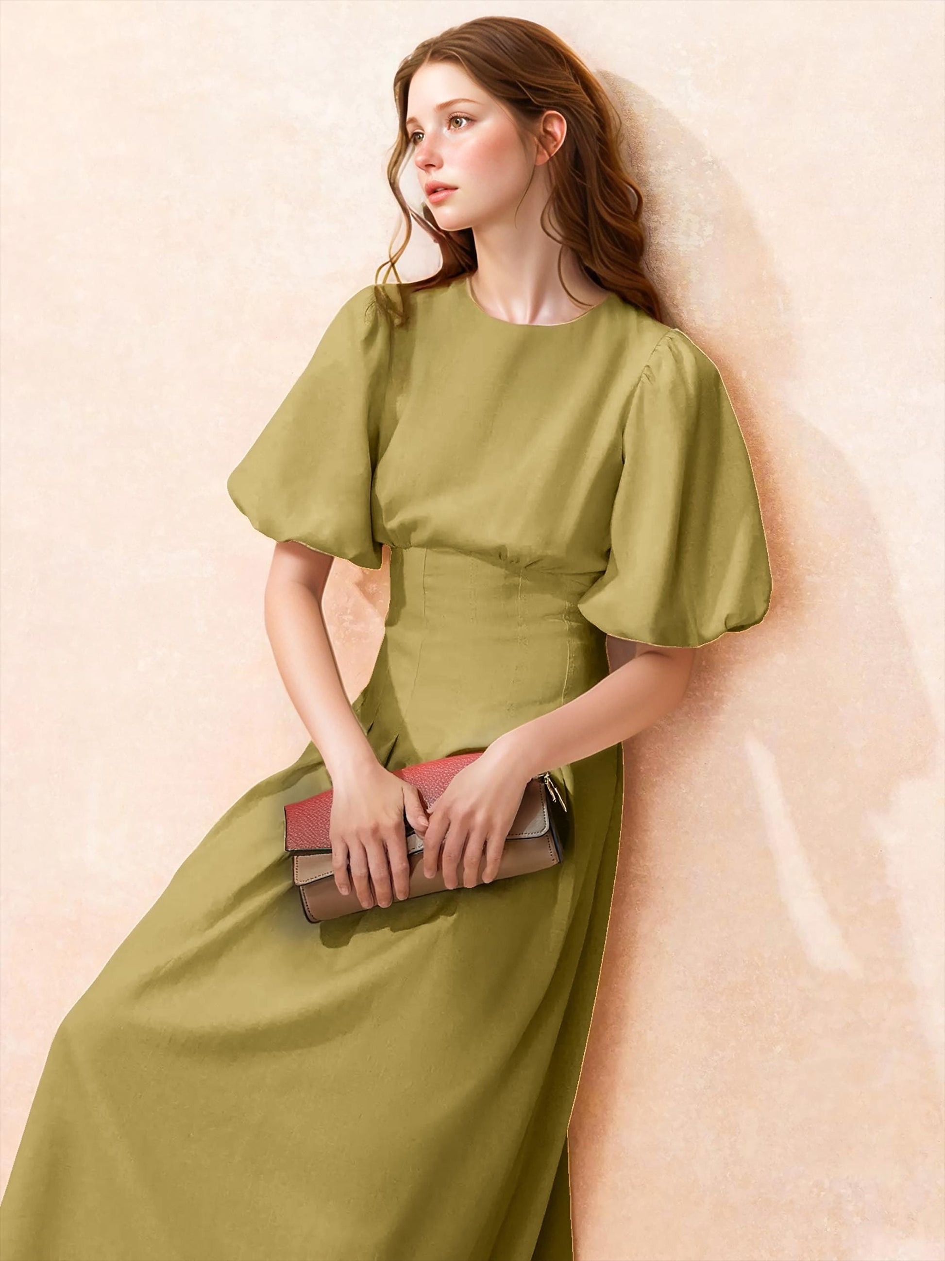 Elegant Olive Elastic Linen Puff Sleeve Maxi Dress – Square Neck, Flowy A-Line, Custom Fit, Summer Boho Chic | SKU.25T15T4A