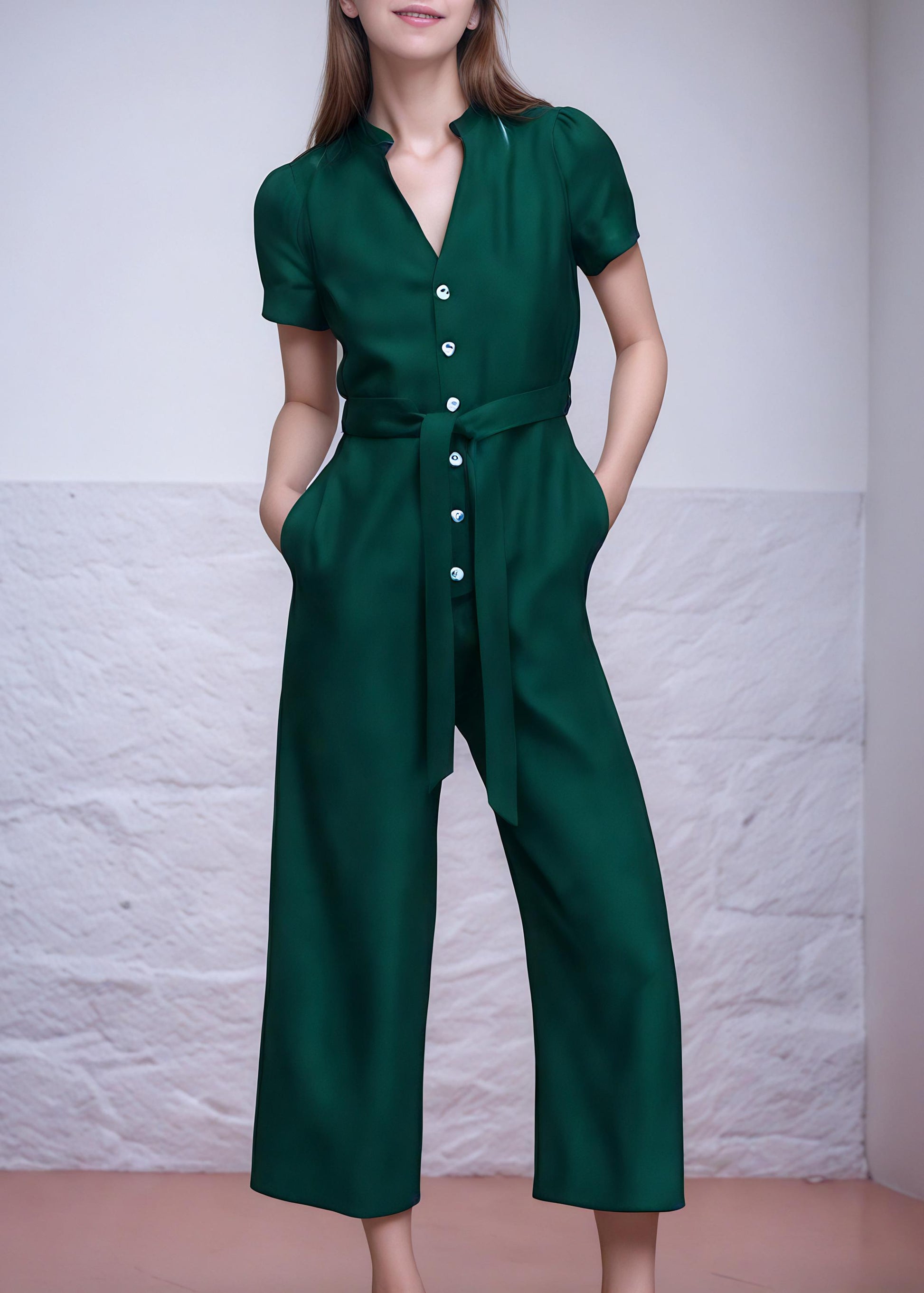 Elegant Satin Wide-Leg Jumpsuit | Short-Sleeve Button-Down Belted Romper | SKU.25T11T7G