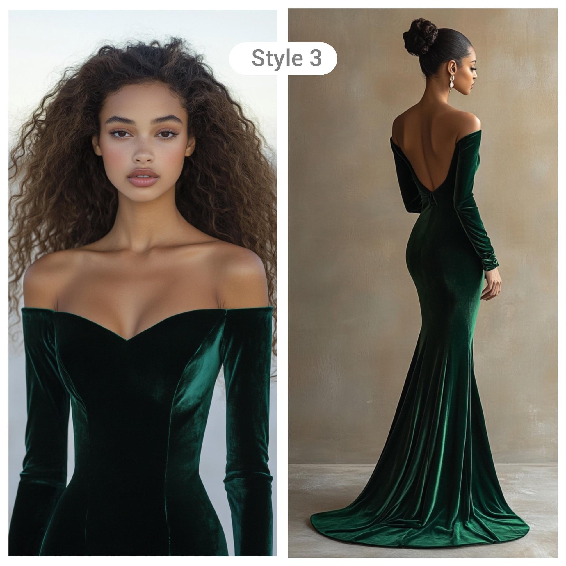 Emerald Green Velvet Evening Gown, Off-Shoulder Custom Tailored Dress, Elegant Long Sleeve Formal Dress for Special Occasions | 241112A