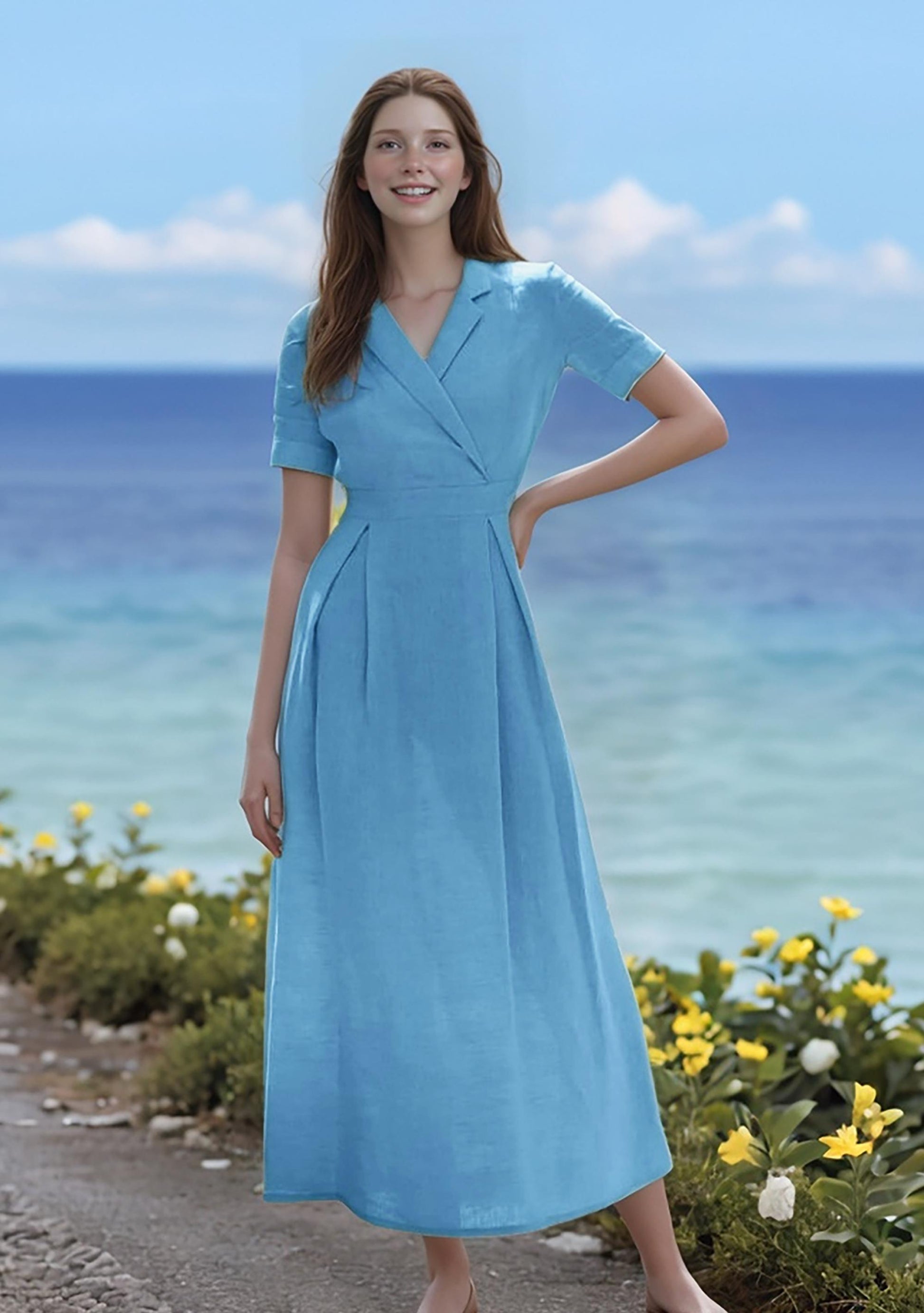 Step into effortless elegance with our Light Blue Linen Midi Dress — a timeless piece designed for sun-soaked days and breezy summer nights. Crafted from breathable, lightweight linen, this dress features a wrap-style V-neckline, tailored short sleeves, and pleated details that flatter your silhouette.