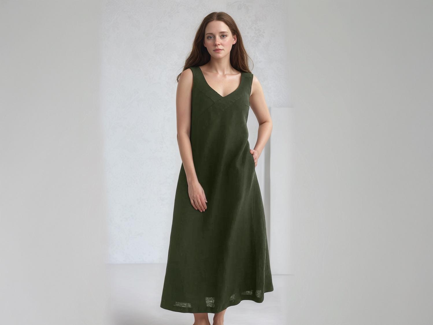 Linen Maxi Dress, Sleeveless Summer Dress, V-Neck Long Dress with Waist Tie, Elegant Flowy Women's Outfit | SKU.25T14T7M