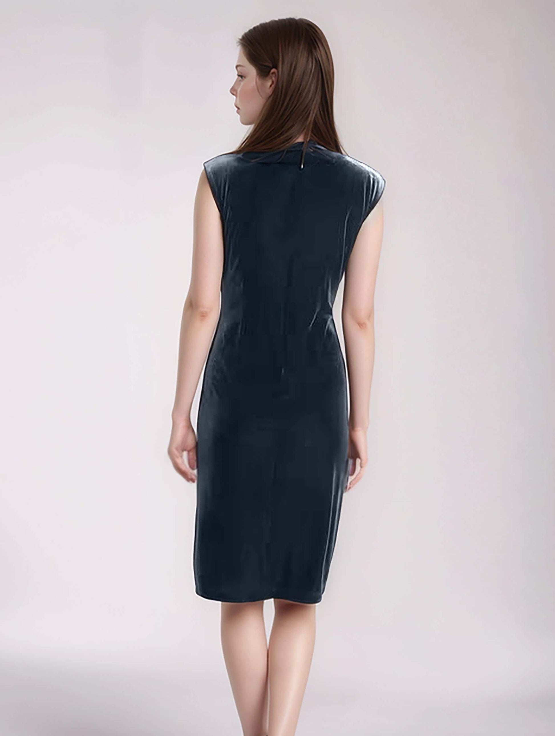 Navy Velvet Shift Dress with Brooch – Elegant Asymmetric Neckline Cocktail Dress | SKU.25T17T6C