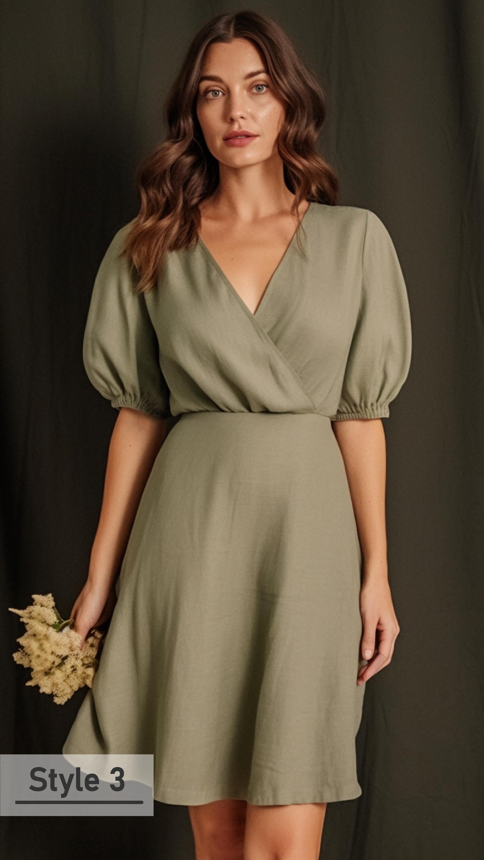 Olive Green Linen Dress with Puffed Sleeves & Waist Belt - Women's Fashion | Customizable | 241016.U5