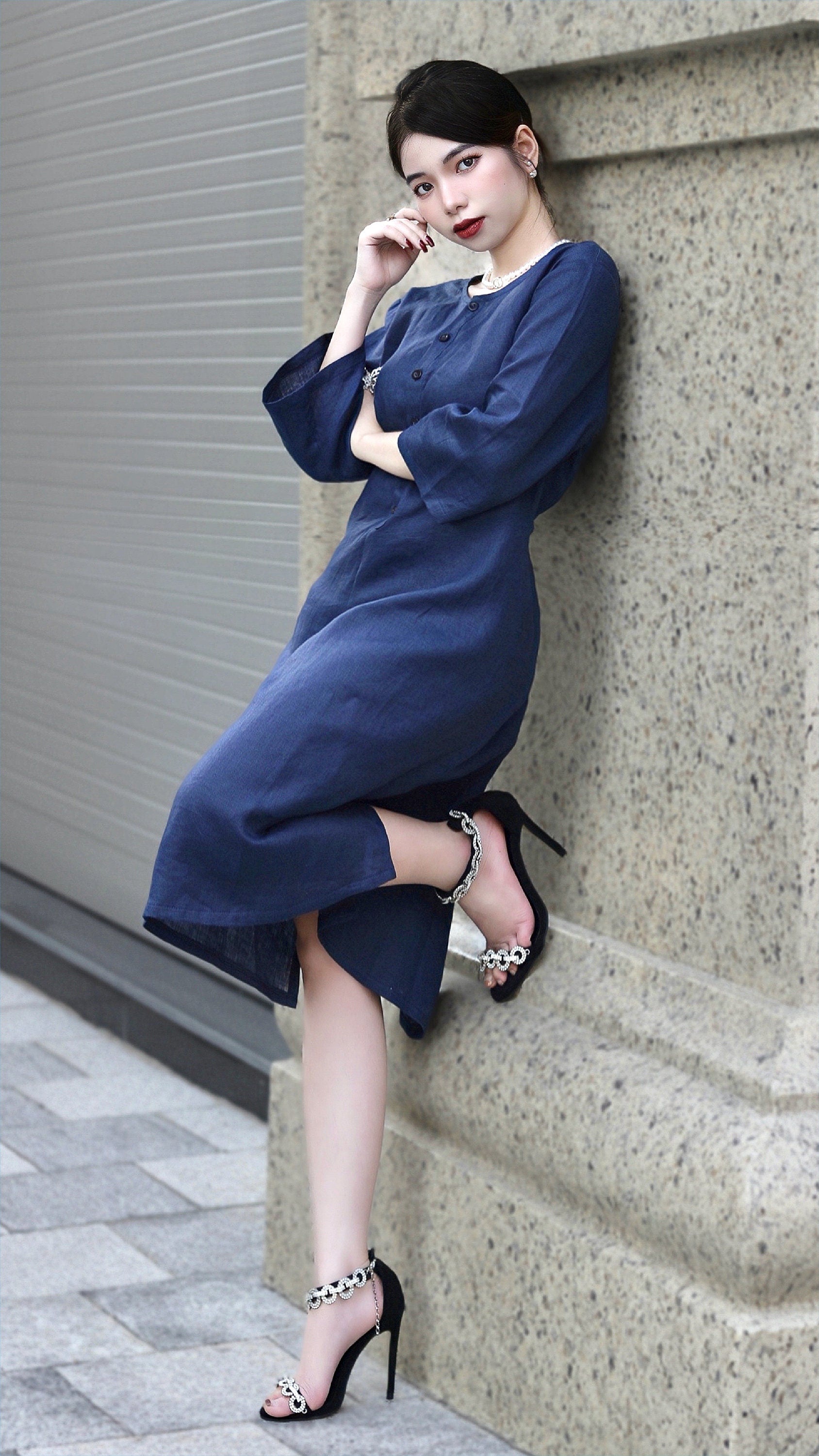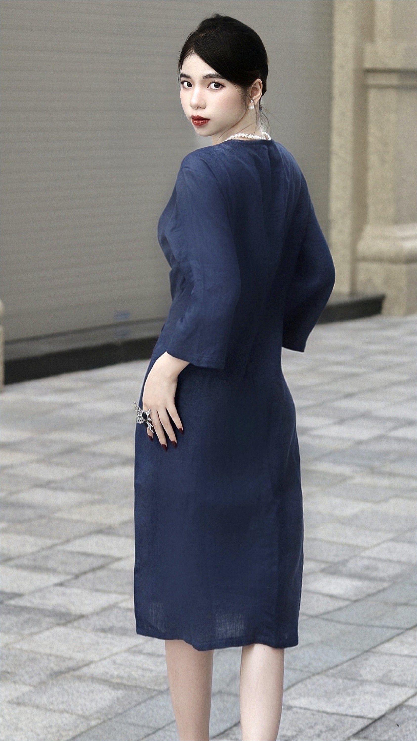 Stylish Linen Midi Dress: 3/4 Sleeves, V-neck, and Customizable Features for Elevated Personalized Fashion | SKU.004
