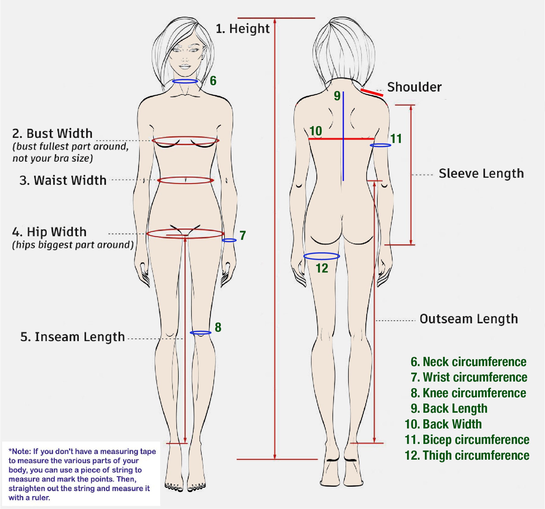 **Note: If you don't have a measuring tape to measure the various parts of your body, you can use a piece of string to measure and mark the points. Then, straighten out the string and measure it with a ruler.